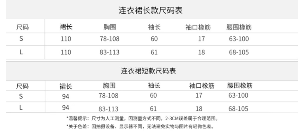 Size Skirt Length (cm / in) Bust (Elastic) (cm / in) Sleeve Length (cm / in) Cuff Elastic (cm / in) Waist Elastic (cm / in)