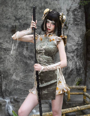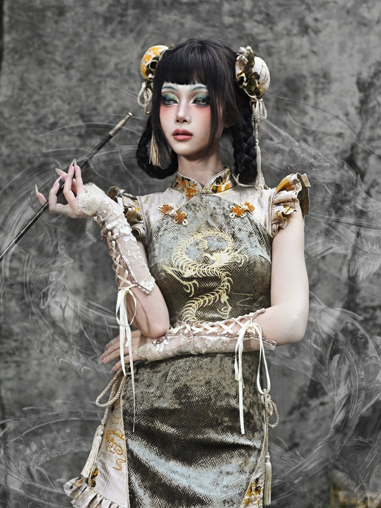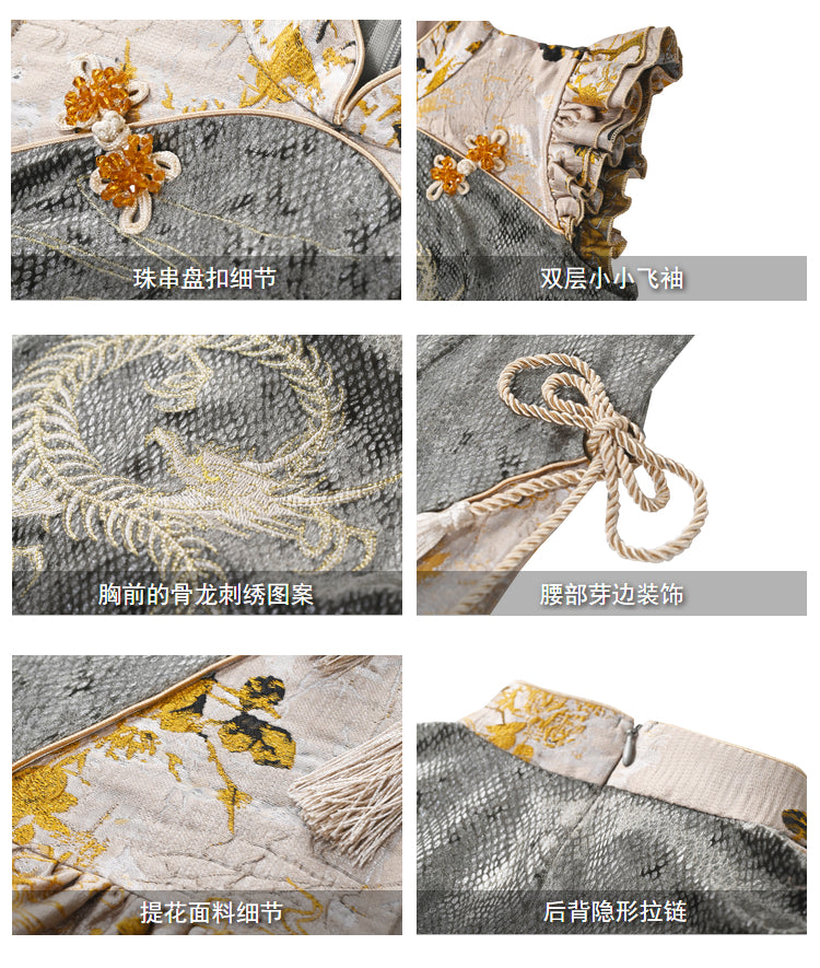 • Unique Details: Highlights include a playful double-layer sleeve, a refined hand-sewn collar with beaded buttons, and an eye-catching golden bone dragon embroidery on the chest.
