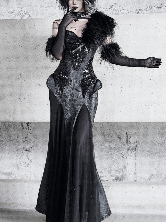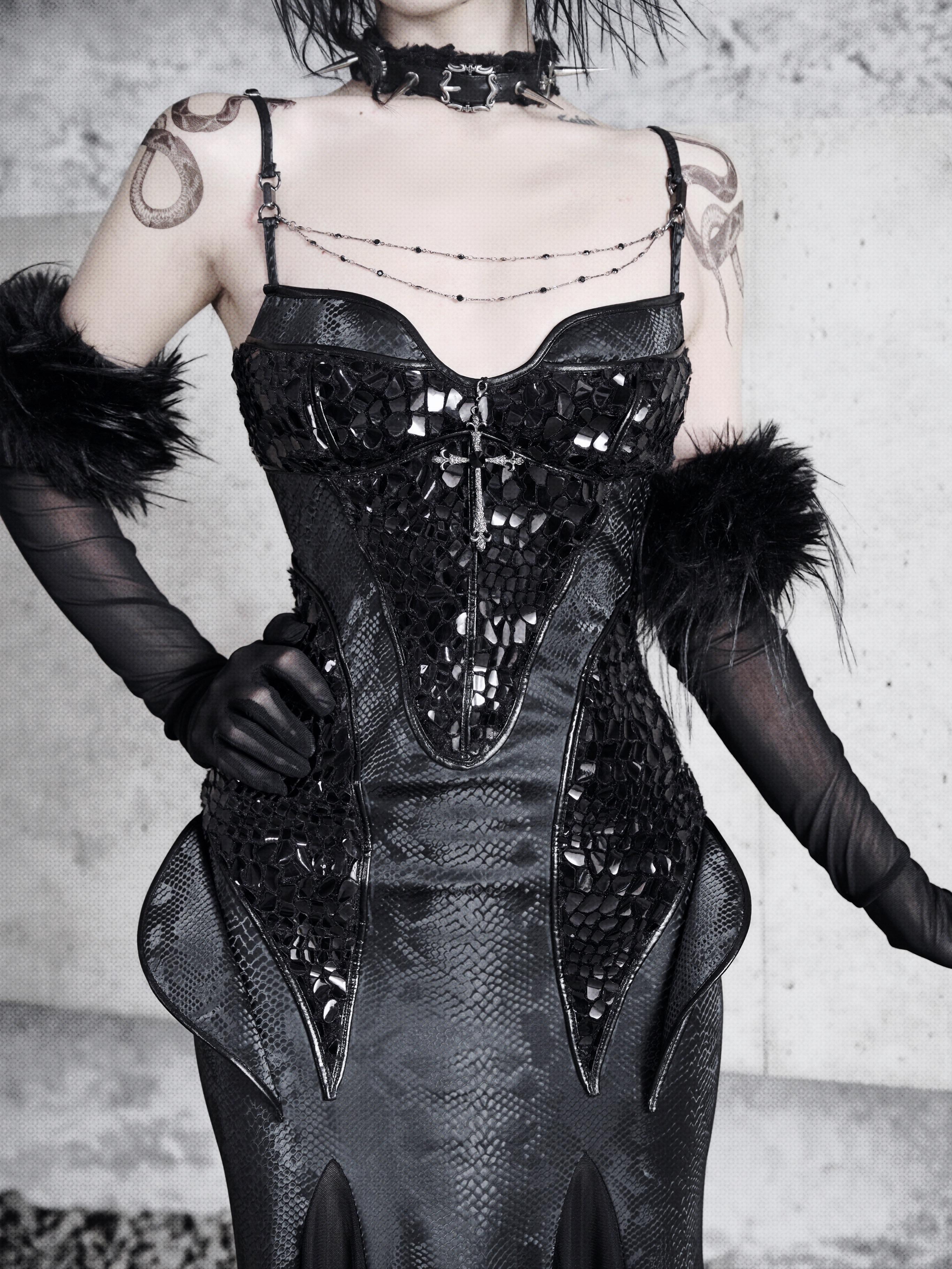 - Sleek, Wild Silhouette: The black elastic PU leather fabric hugs the body, suggesting the untamed ferocity of a black mamba. The surface features an optical serpentine texture that shimmers and shifts as you move.