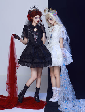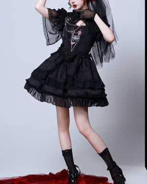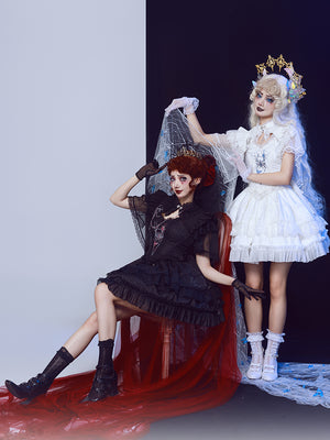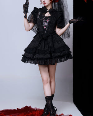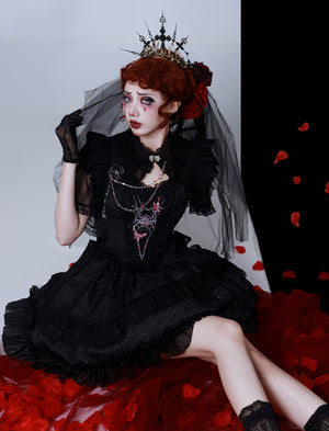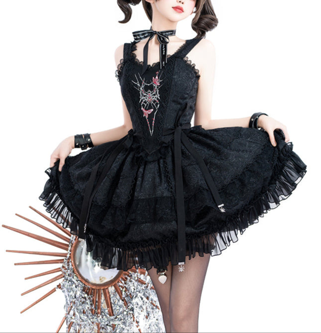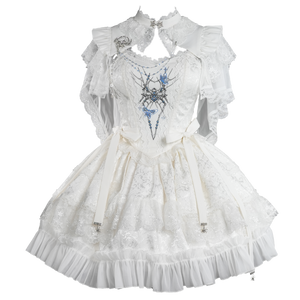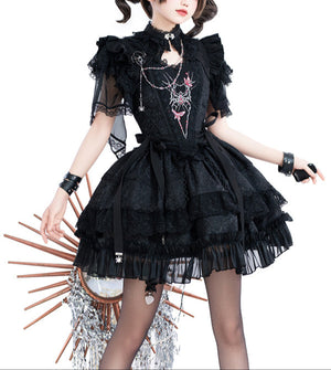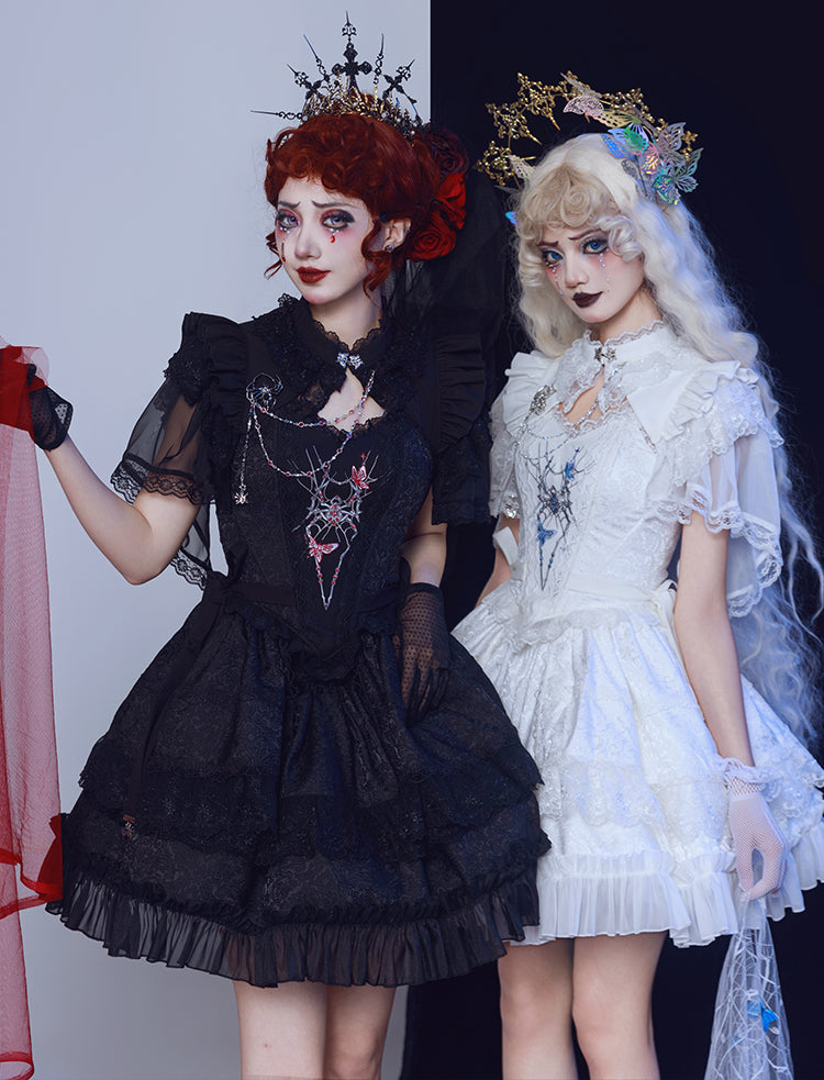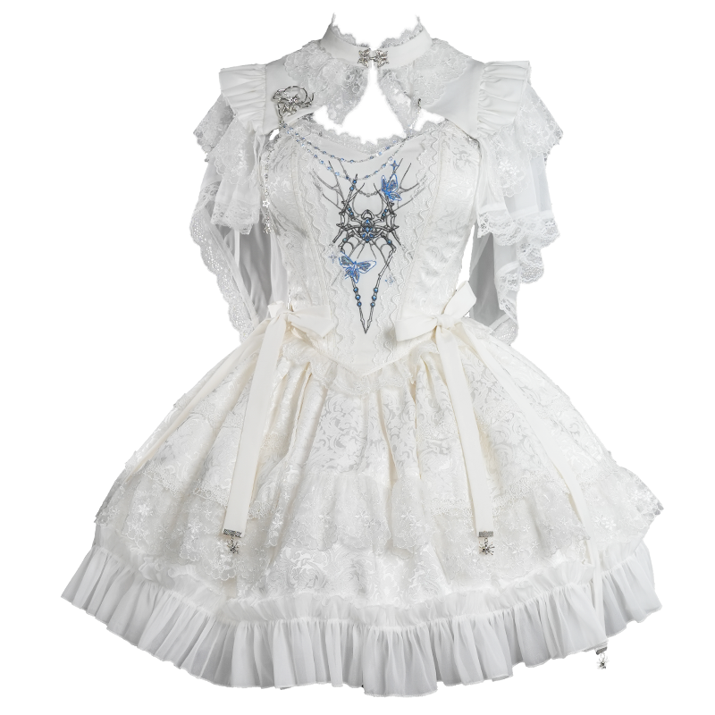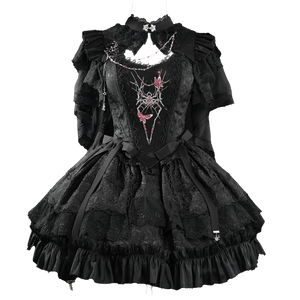 - Complete Outfit: The set includes Shoulder Pads (or Epaulets), a Camisole Bustier/Corset, a Skirt, and a Spider Brooch for full accessorization.