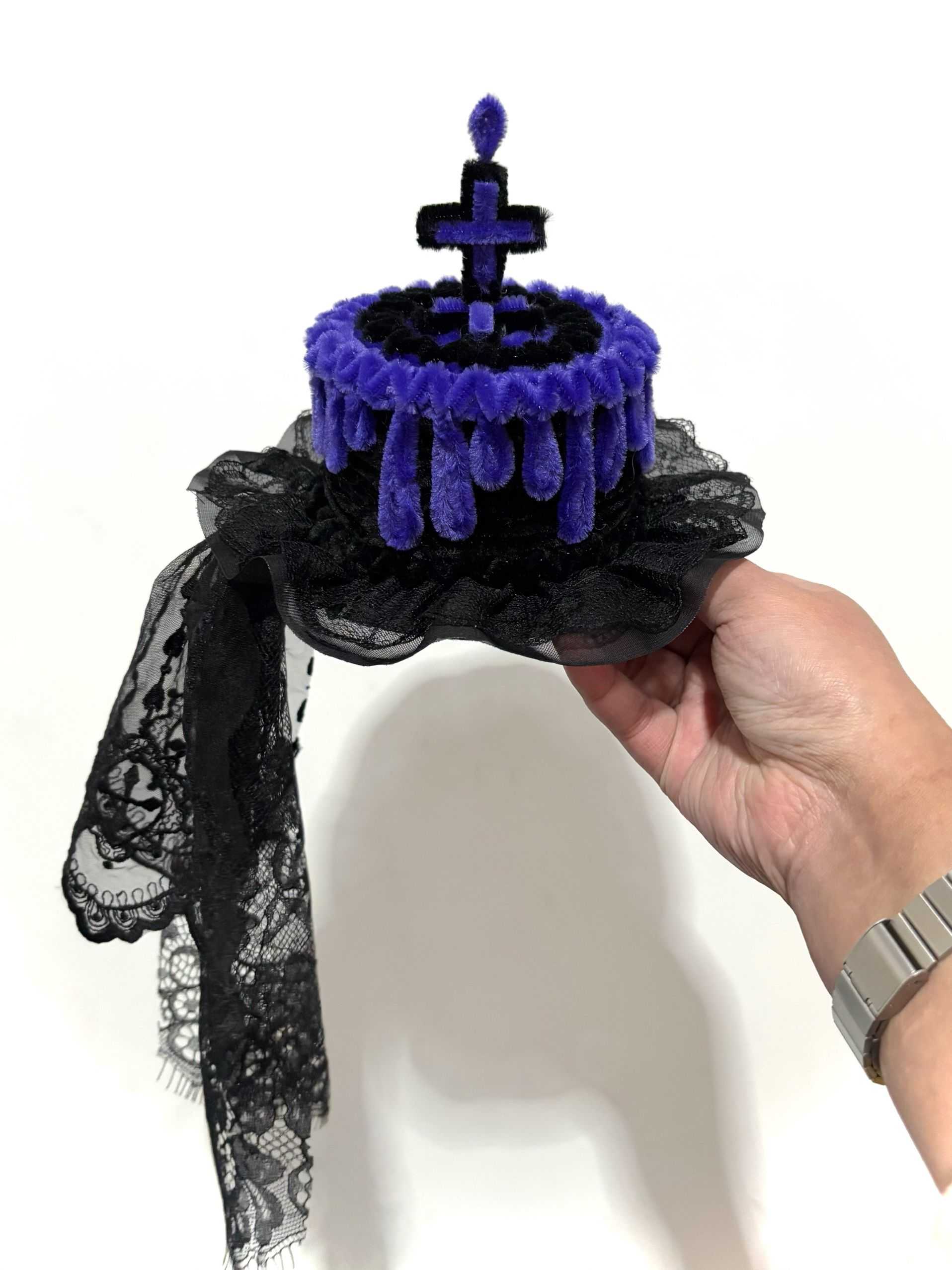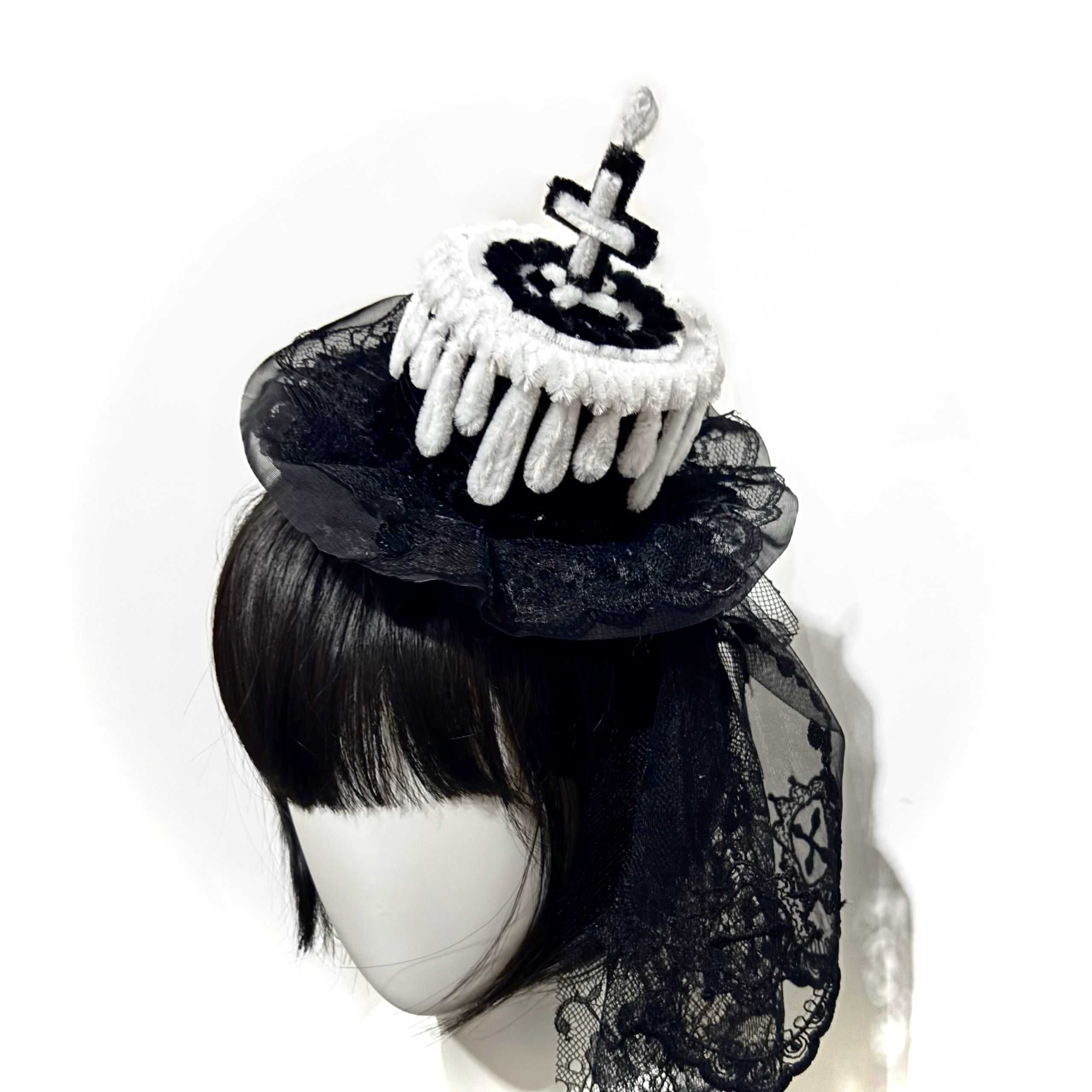 - Mini-Hat: The base of the headpiece is secured by two alligator clips (shown in the bottom image) for firm attachment to hair or a wig. The black lace on the base measures approximately in length (including the lace trim).