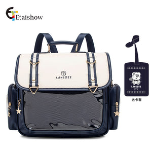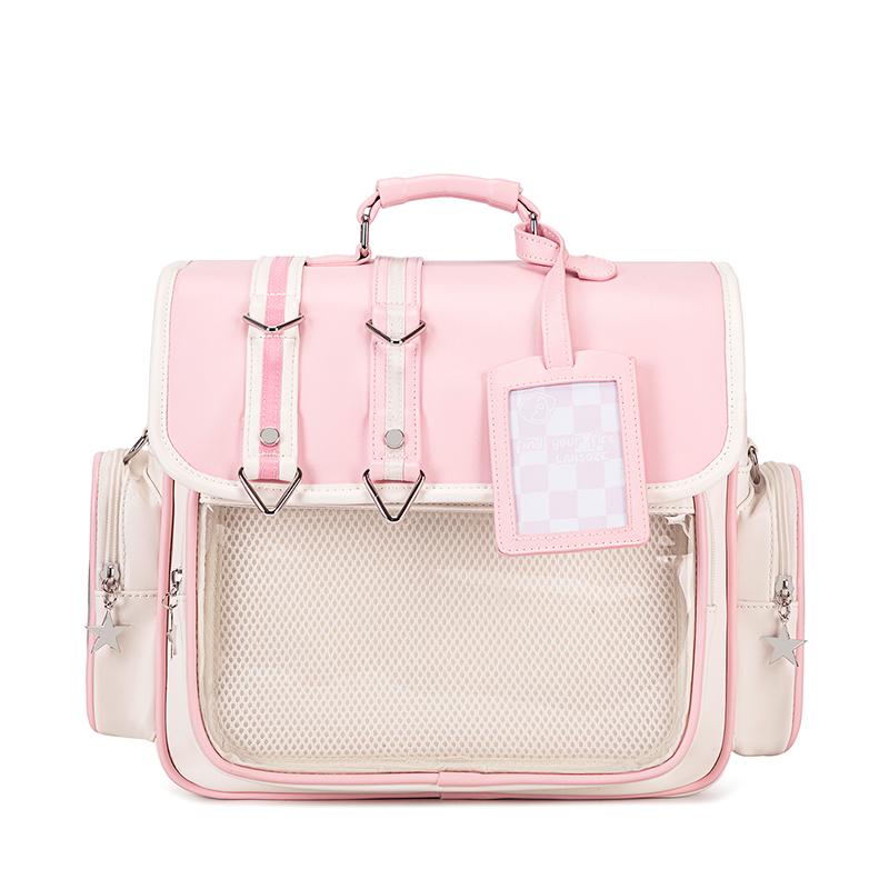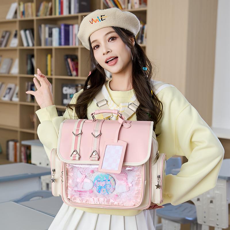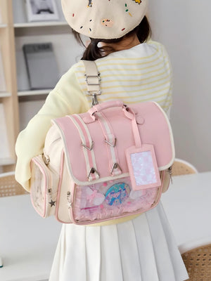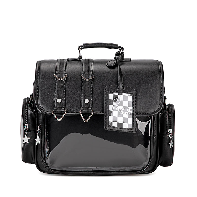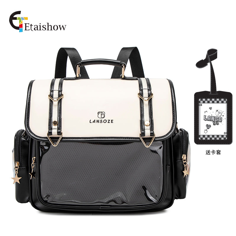 This is a spacious and customizable ita backpack, featuring a large transparent display window perfect for showcasing your favorite character merchandise and pins.
