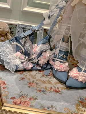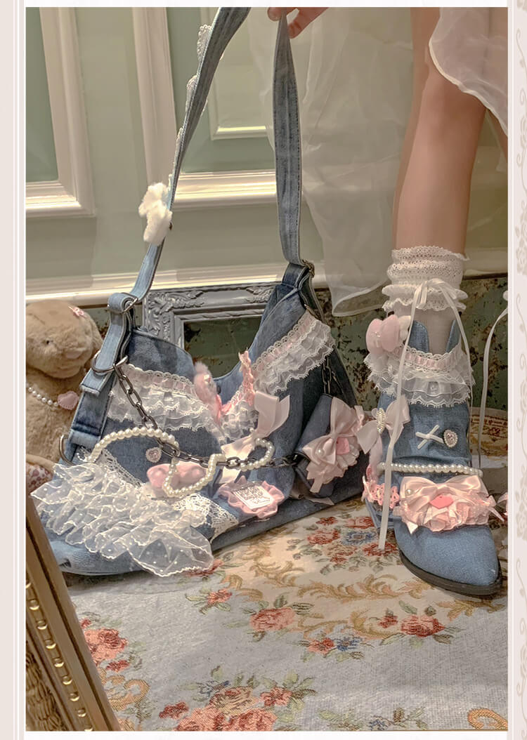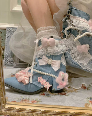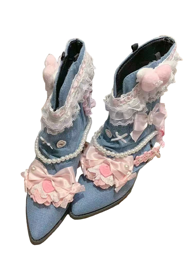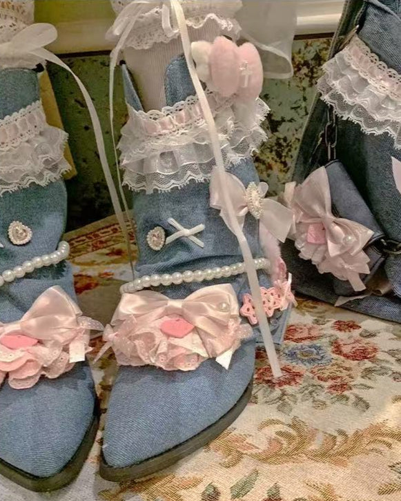 Lolita Bow Lace Denim Pointed Toe Ankle Boots LE5003