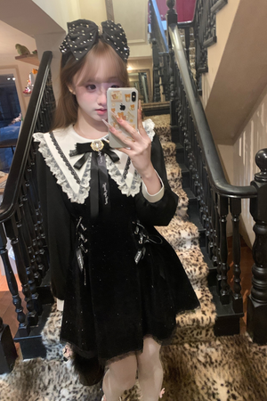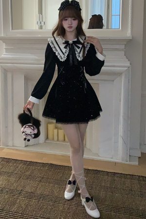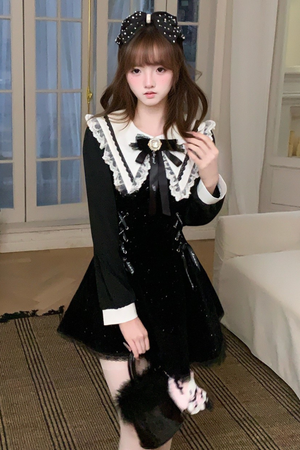 Girly Fashion Black Navy Collar Winter Dress