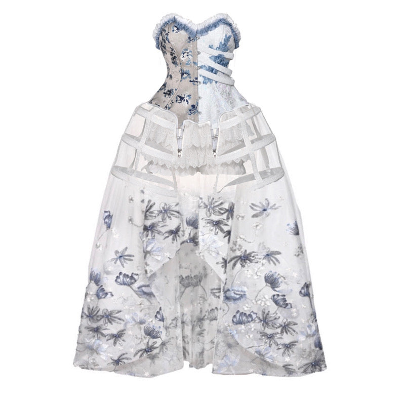 - Fabric and Fit: The delicate jacquard fabric in blue and gray tones, combined with a shiny white organza, gives the dress its distinctive look. It features a tailored, slim-fit silhouette with a three-dimensional cut at the waist for a naturally contoured shape.