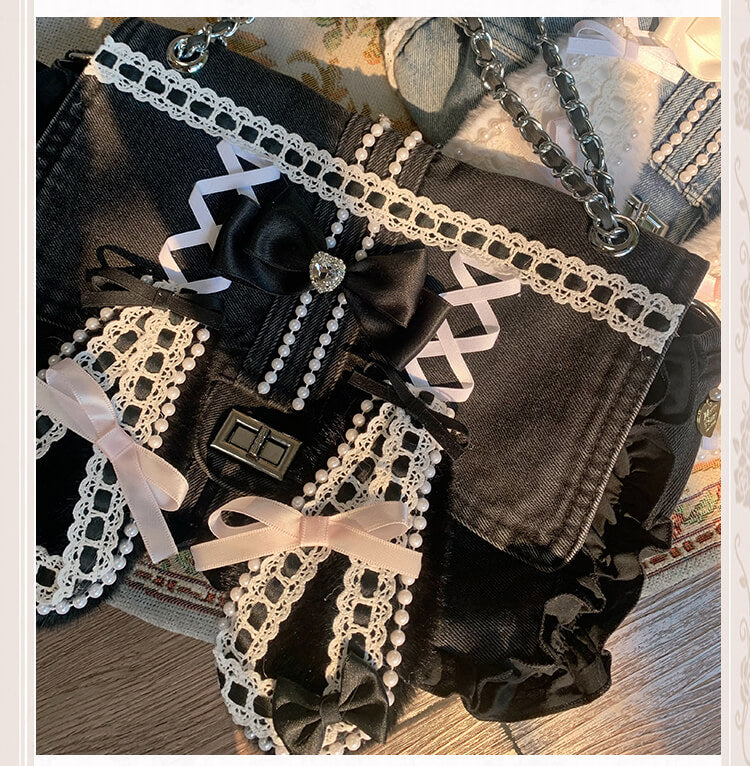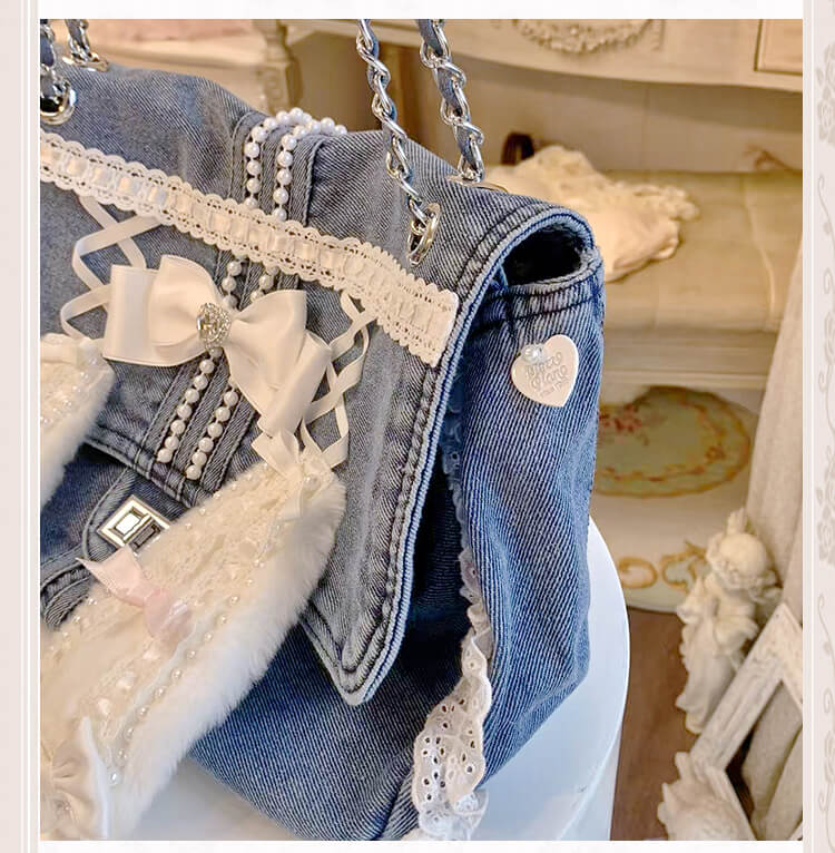 Embrace a touch of whimsy with this enchanting denim bag. Adorned with fluffy rabbit feet charms, delicate lace, and pearls, this bag is a perfect blend of casual style and sweet charm.