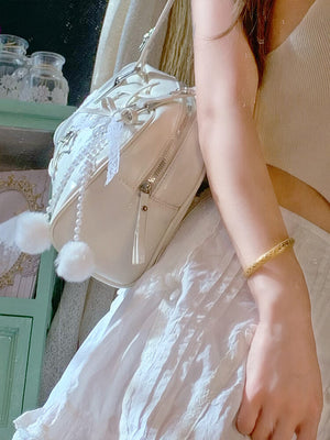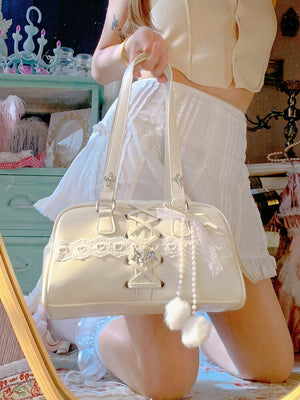 Embrace a touch of sweet charm with this elegant off-white handbag. Its central lace-up design, delicate lace trim, and charming pom-pom charm give it a unique and romantic aesthetic.