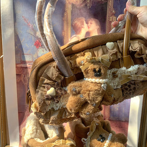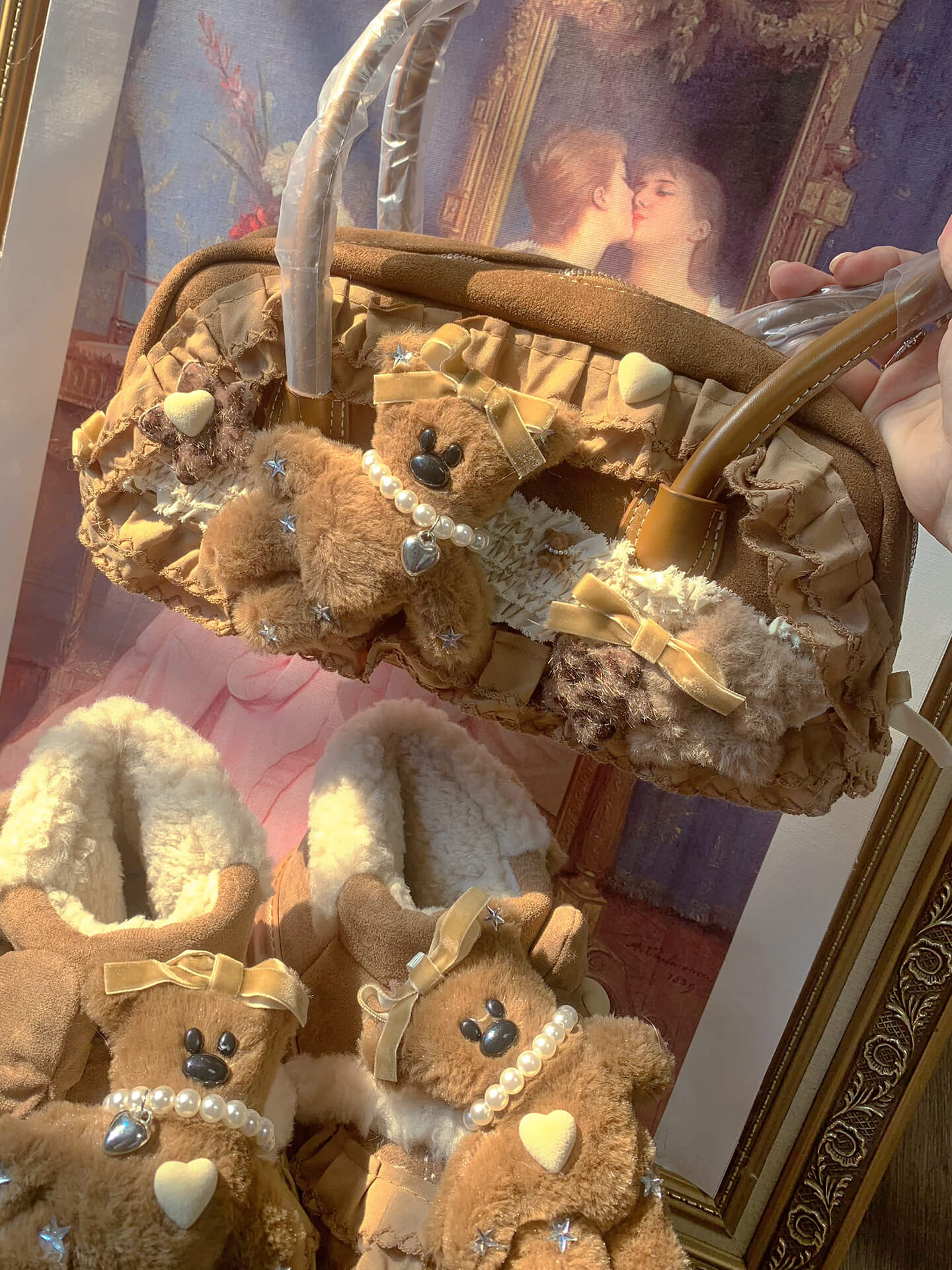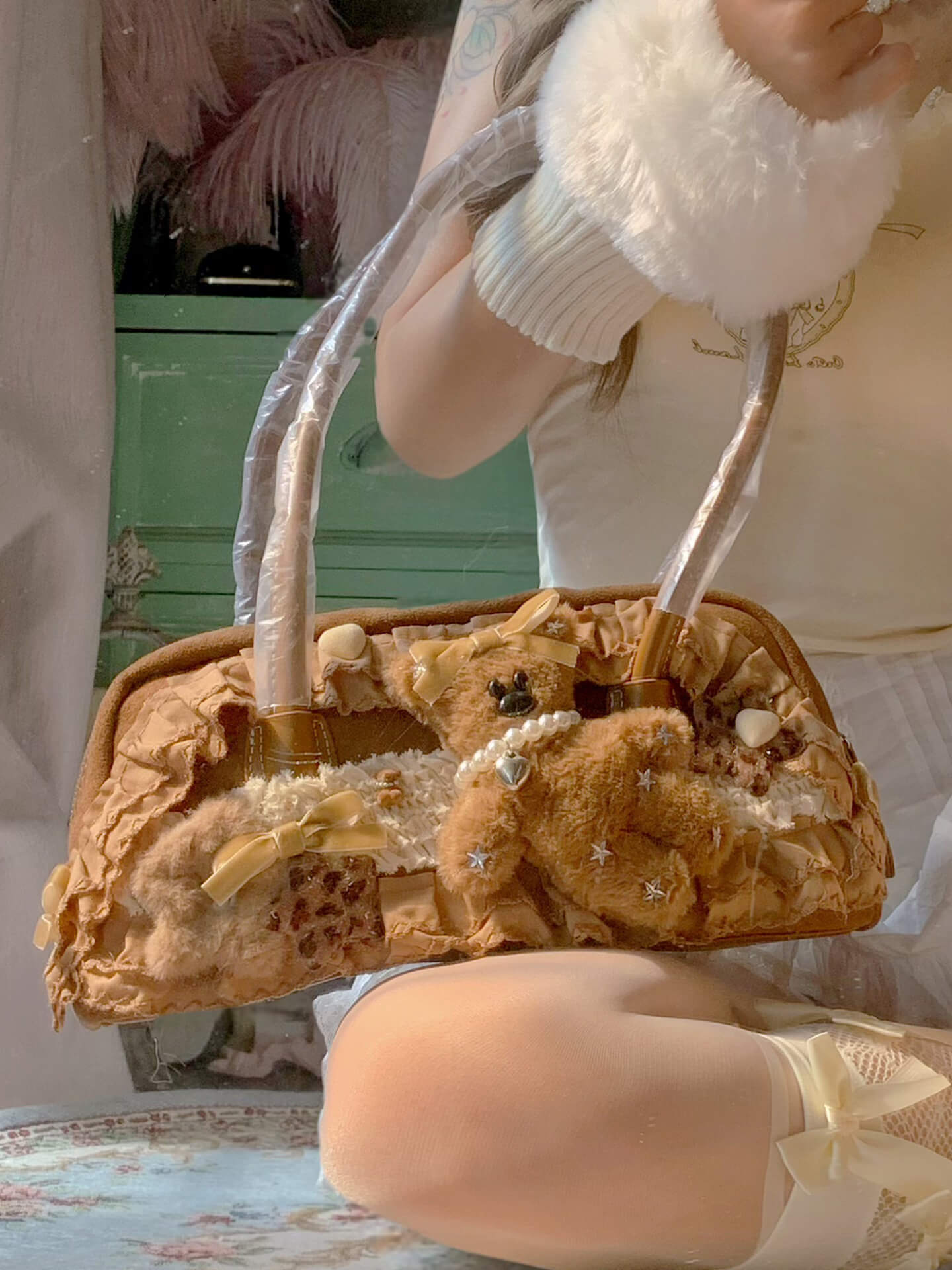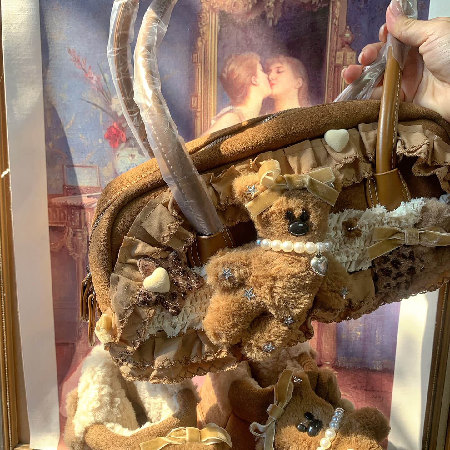 Step out in whimsical style with this adorable brown tote bag. Adorned with a plush teddy bear, ruffled lace, and intricate details, it's the perfect accessory for adding a cozy, cottage-core touch to your look.