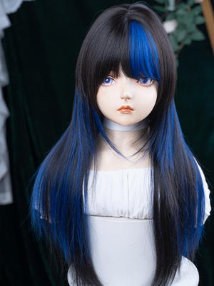 The deep black base is beautifully accented with rich ultramarine highlights, creating a bold, eye-catching contrast. The soft, voluminous curls add movement and a dynamic feel, making this wig a perfect choice for cosplay, themed parties, or a head-turning fashion statement.