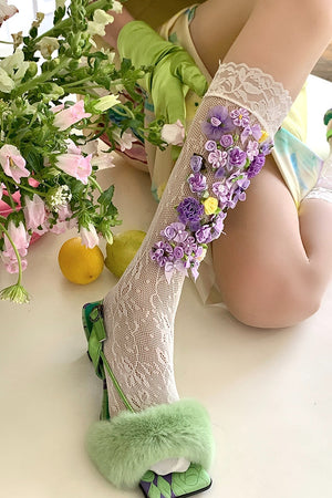 Сказочные фиолетовые носки с цветочным узором в стиле французского винтажа и бантом LE9034
